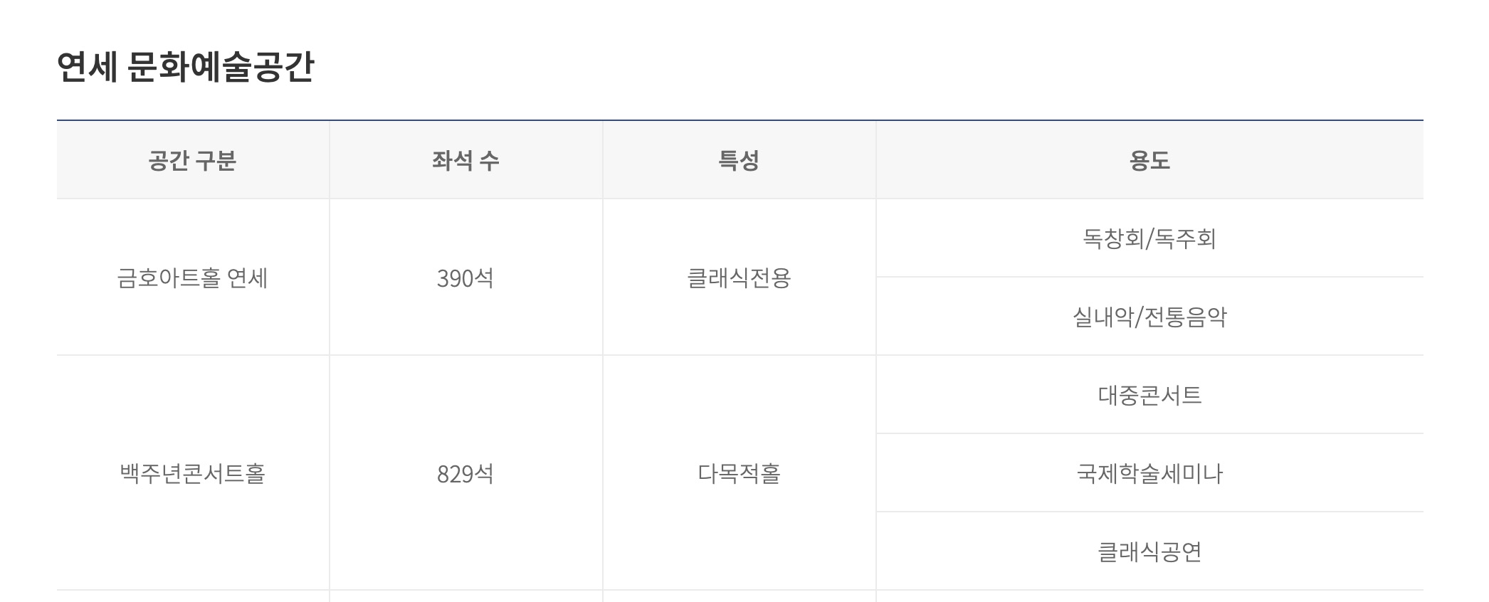 - 기타 시설: 금호아트홀연세(390석), 대강당(1,645석), 노천극장(7,500석) 등